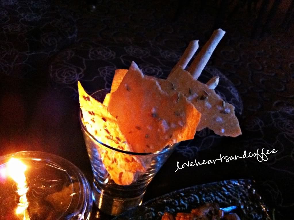 Breadsticks + Cumin-seeded crackers, lightly salted.