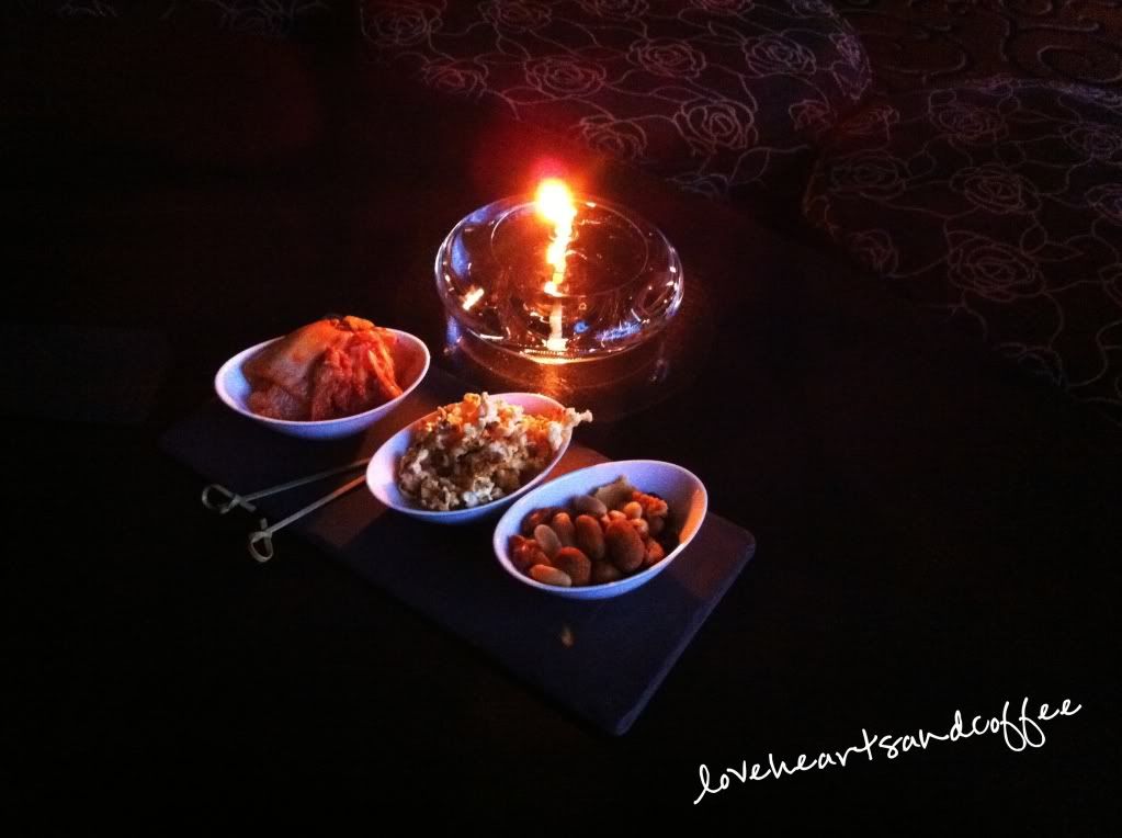 We were served some snacks as we waited for our orders. There was kimchi, caramelized popcorn, and mixed nuts. I liked the kimchi & honey bear loved the nuts; the caramelized popcorn was way too soft, not at all crunchy><